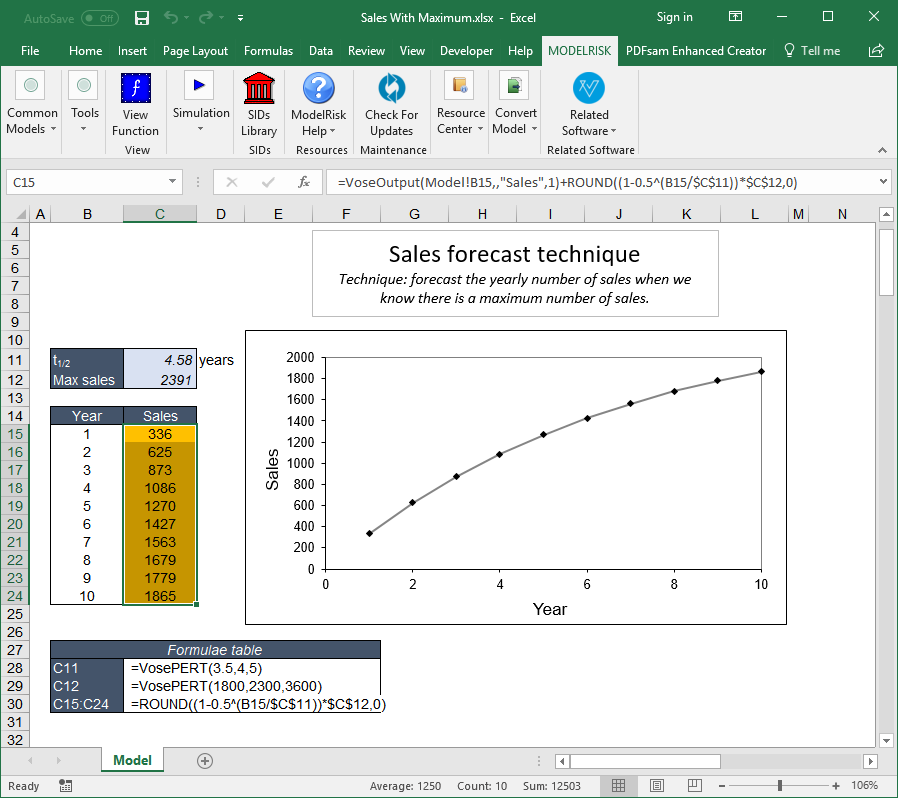 Sometimes we might find it easier to estimate what our annual sales will be when stabilized, but be unsure of how quickly we will be able to achieve that stability. In this sort of situation it can be easier to model a theoretical maximum sales and match it to some ramping function. A typical form of such a ramping function r(t) is: which will produce a curve that starts at 0 for t = 0 and asymptotically reaches 1 at an infinite value of t, but reaches 0.5 at t1/2. Consider the following problem: you expect a final sales rate of PERT(1800,2300,3600) and expect to achieve half that in the next PERT(3.5,4,5) years. Produce a sales forecast for the next 10 years. The example model below provides a solution: